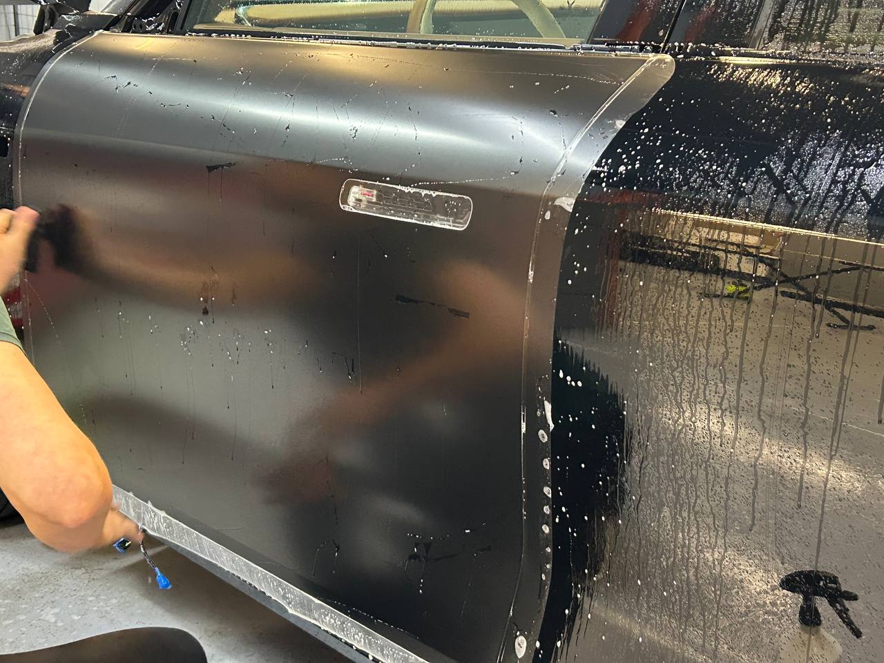 Чтобы пленка плотно прилегала к кузову и не отслаивалась со временем, поверхность должна быть чистой и сухой. Для обезжиривания применяют универсальные очистители или спиртосодержащие составы. Это убирает любые жировые пятна, пыль и химические вещества, которые могут повлиять на адгезию пленки.