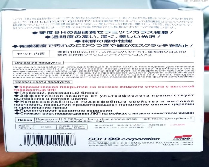 Покрытие профессионального уровня обеспечивает продолжительную защиту от царапин, кислот, щелочей, грязи, придаёт восхитительный блеск и сохраняет свойства лакокрасочного покрытия автомобиля. Состав разрабатывался компанией Soft99 специально для тяжелых условий СНГ; были проведены все необходимы тесты, в т.ч. влияние высокощелочных шампуней (ph12) и зимних реагентов на состав. Даже в таких условиях H-9 ULTIMATE QUARTZ показал великолепные результаты: высокую степень защиты кузова автомобиля, великолепный гидрофоб и невероятный блеск ЛКП. Кроме того, состав достаточно тягуч – 1 флакона хватит для обработки до 3 средне-размерных автомобилей!
