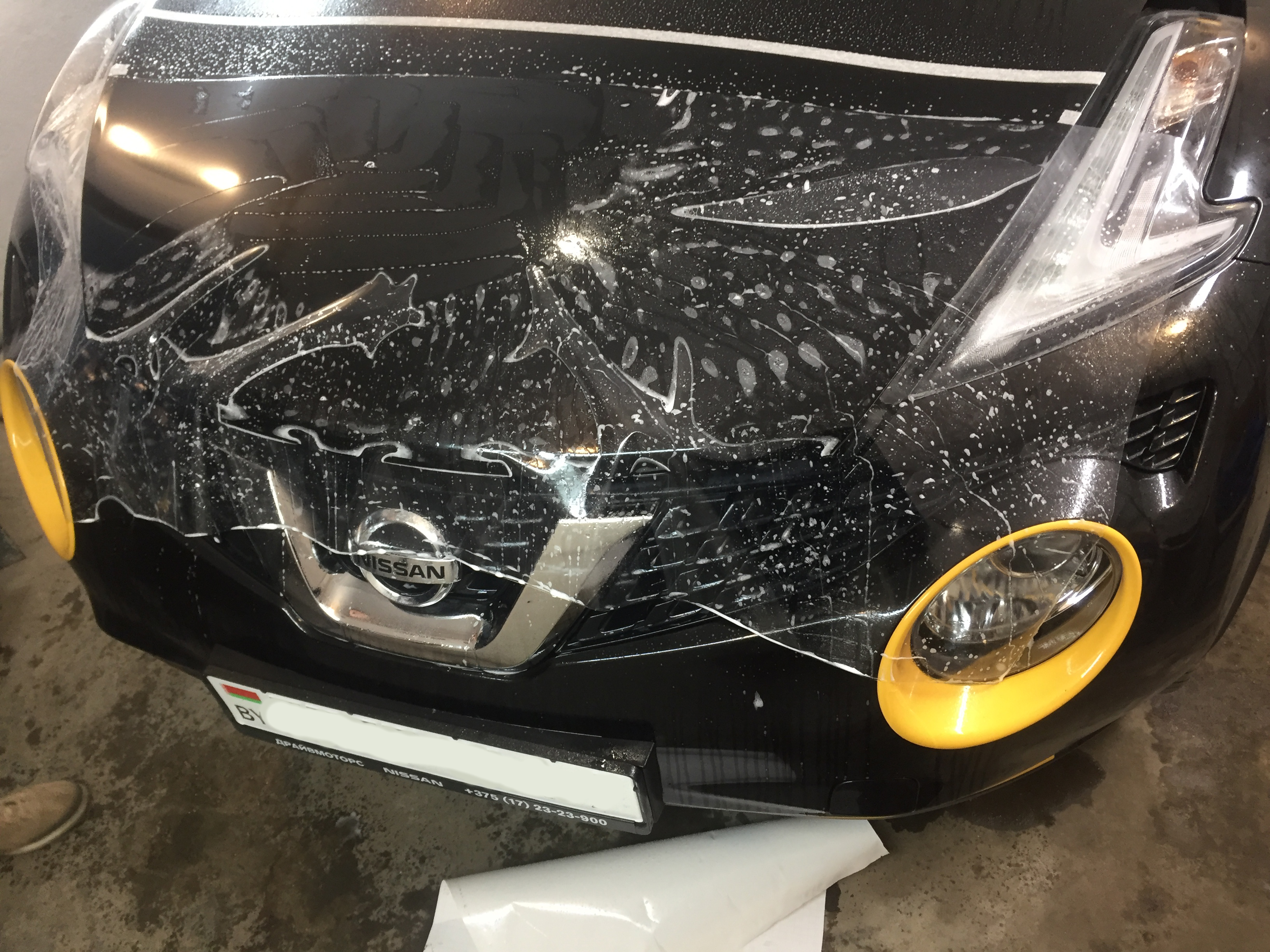 Ниссан джук оклейка части капота, части крыла в антиравийную прозрачную пленку. Так же оклеены зоны под ручками, пороги внутренние.